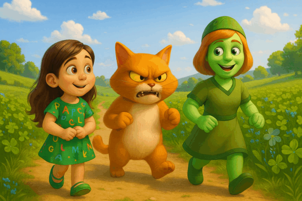 So off they went—Alphabet Allie with her boundless curiosity, Annie Leprechaun with her magical charm, and Angry Cat, still a little grumpy, but secretly thrilled.